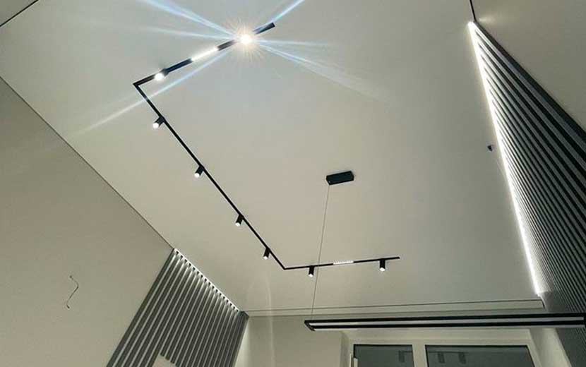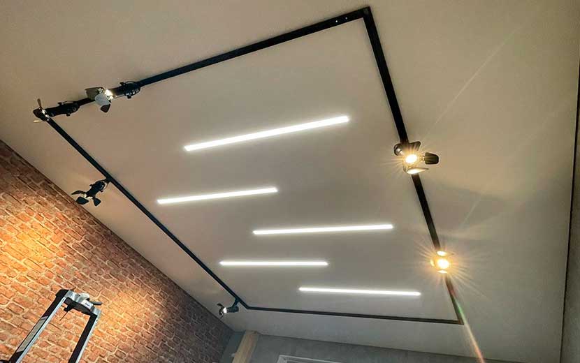 Если устанавливаемый натяжной потолок не имеет сложных конструкция и большого количества светильников, монтаж займет 3-4 часа.